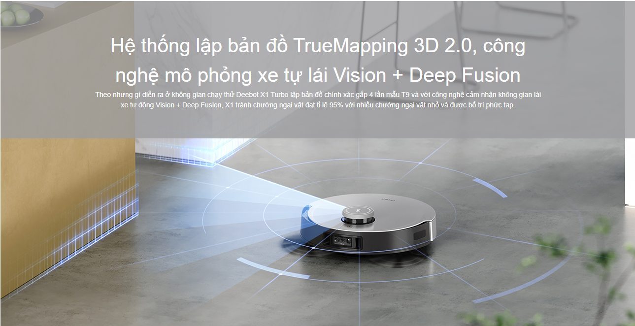 Hệ thống bản đồ là một trong những điểm nhấn công nghệ quan trọng mà Deebot X1 Turbo được sở hữu. Nó giúp nâng cao khả năng lập bản đồ gấp 4 lần so với các phiên bản trước đó. Sự kết hợp giữa công nghệ phỏng xe tự lái Vision + Deep Fusion và TrueMapping 2.0 giúp tối ưu khả năng tránh né vật cản lên đến 95%.