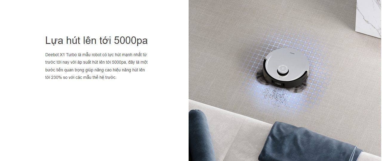 Không những có khả năng lập bản đồ, xử lý thông tin và định hình đường dọn dẹp hiệu quả robot Deebot X1 Turbo còn có khả năng dọn dẹp rất đáng nể với công suất hút bụi vượt bậc lên đến 5000Pa. Động cơ mạnh mẽ giúp tối ưu hóa áp suất hút nhằm đảm bảo mọi tuyến đường mà thiết bị đi qua đều không còn tồn đọng bụi bẩn.
