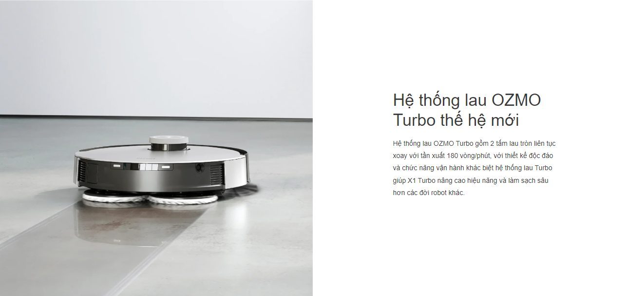 Sản phẩm không chỉ có lực hút mạnh mẽ nó còn có thể tiến hành lau chùi mặt sàn cùng lúc nhờ công nghệ OZMO Turbo nhằm đem lại hiệu quả cao khi sử dụng. Khi quay trở lại với trạm sạc, robot sẽ được cấp nước và hong khô bằng gió lạnh để bảo đảm sẵn sàng cho lần làm việc tiếp theo.