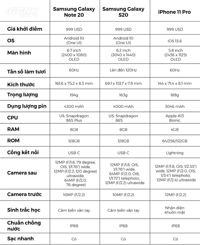 So sánh giữa Galaxy Note 20 với người tiền nhiệm S20 và đối thủ iPhone 11 Pro.