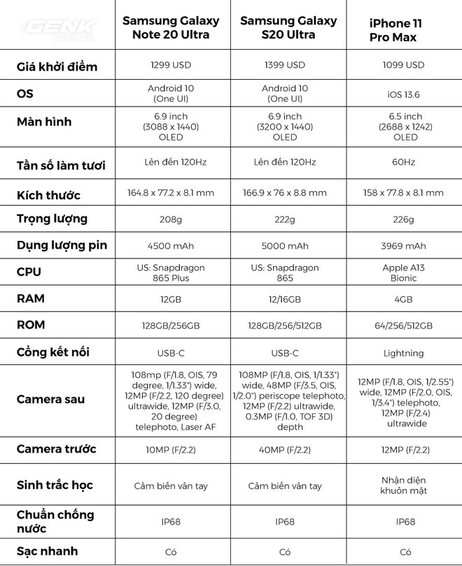 So sánh nhanh Galaxy Note 20/Note 20 Ultra với thế hệ tiền nhiệm S20 và đối thủ iPhone 11 Pro/Pro Max