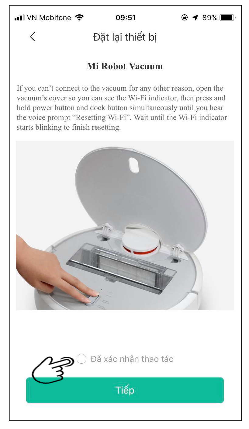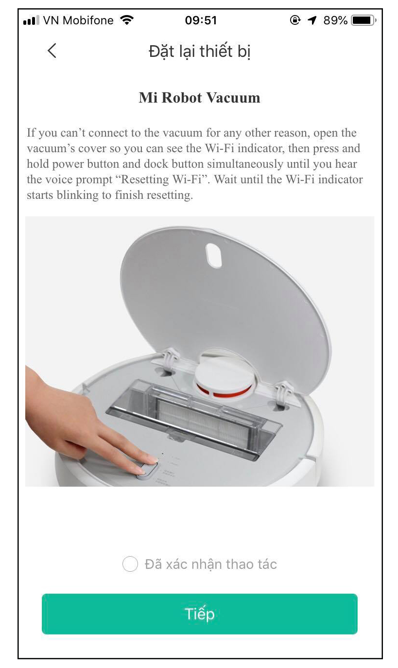 Bạn cần quay lại yêu cầu cài đặt lại robot hút bụi khi nãy và bấm vào Đã chấp nhận thao tác và chọn Tiếp. Nếu không thấy đèn báo xanh nhấp nháy bạn hãy khởi động lại máy lần nữa.