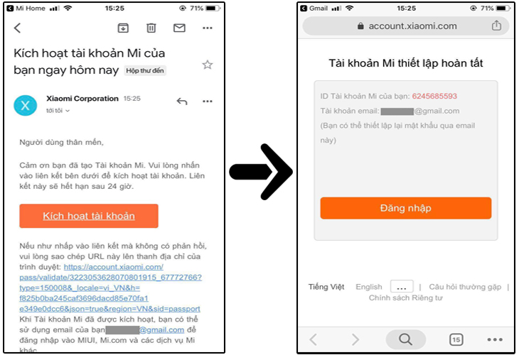 Sau khi bấm vào "Kiểm tra hộp thư của bạn" thì bạn sẽ được dẫn về email của mình như bên dưới, hãy bấm vào Kích hoạt tài khoản để nhận thông báo thành công.