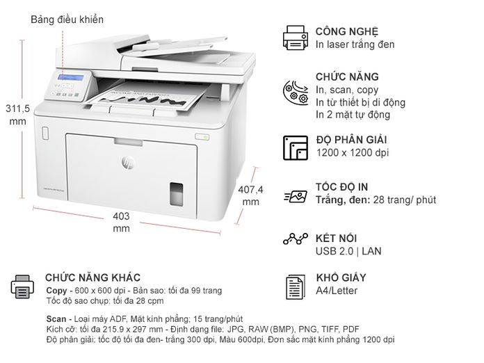 Cung cấp bản in, bản sao chụp rõ nét, chất lượng cao với độ phân giải quang học tối đa 1200 x 1200 dpi (in) 600 x 600 dpi (copy) 600x1200 dpi (scan).