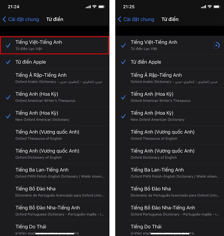 Bước 2. Bạn chọn Tiếng Việt - Tiếng Anh và đợi iPhone tải dữ liệu từ điển về.