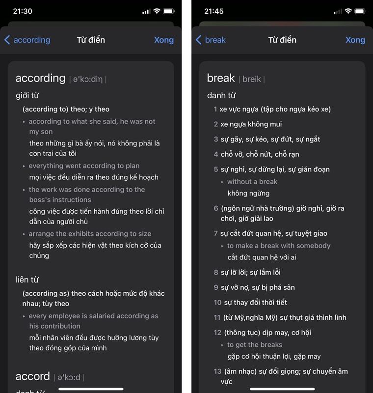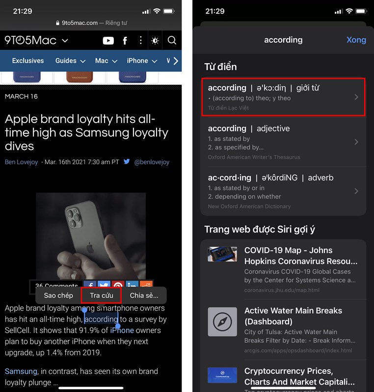 Bước 3. Khi đã kích hoạt từ điển thành công, bạn có thể tìm bất cứ từ nào mà mình muốn dịch. Nhấn giữ vào từ đó > Tra cứu và kết quả của Từ điển sẽ hiện ra cho bạn.