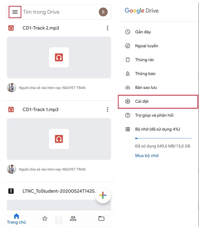 Bước 1: Bạn hãy mở Google Drive lên và vào phần Cài đặt theo chỉ dẫn bên dưới.
