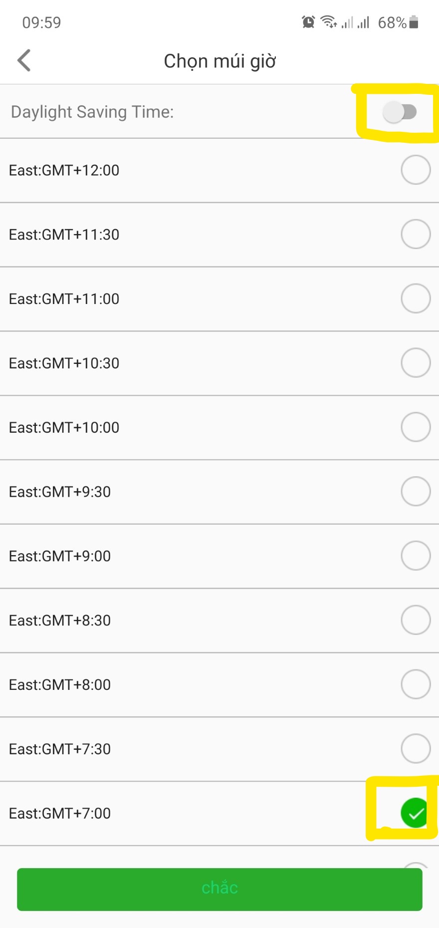 Các bạn chọn múi giờ +7, là giờ Việt Nam. Không được chọn Saving Time, khi chọn Saving Time, đồng hồ sẽ bị chậm hơn 1 tiếng so với giờ thực tế.