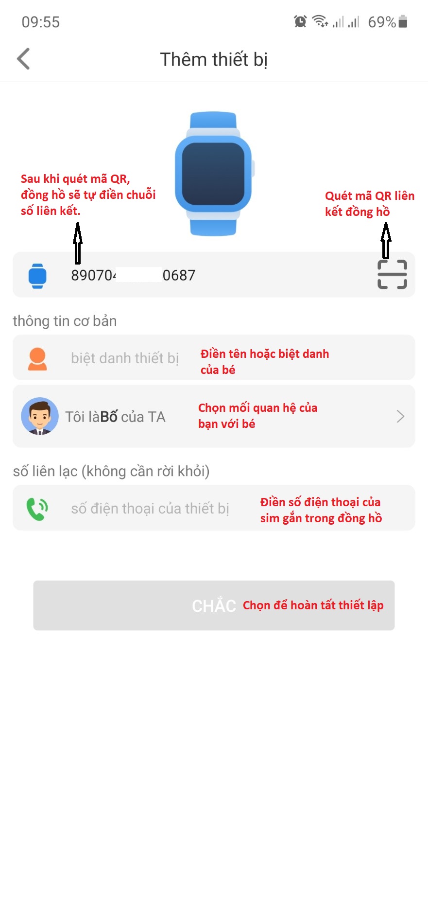 Lưu ý: Có một số đồng hồ cần gắn sim có 3G/4G vào mới tự động kích hoạt, chờ khoảng 5 phút đồng hồ sẽ hiện mã QR liên kết.