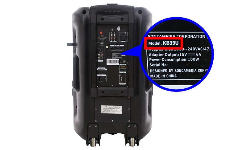 1.Bạn có thể tìm thấy thông tin tên model của dàn loa Acnos ngay tại mặt sau phần tem thông từ hãng, theo ví dụ hình ảnh dưới thì đây chính là loa kéo model KB39U.