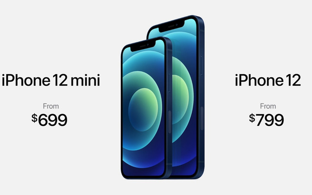 iPhone 12 mini và iPhone 12 sẽ có mức giá khởi điểm lần lượt là 699 USD và 799 USD. Mức giá này của bản 6.1 inch đắt hơn so với iPhone 11 năm ngoái 100 USD. Năm nay Apple cũng cho biết iPhone mới sẽ không đi kèm củ sạc và tai nghe kèm theo trong hộp, thay vào đó người dùng sẽ phải mua riêng hoặc tận dụng các củ sạc cũ.