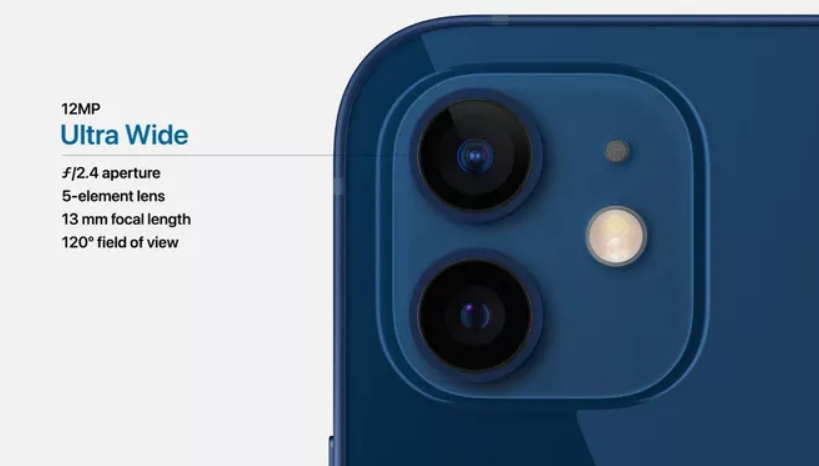 Bộ đôi iPhone 12 mini và iPhone 12 được trang bị cụm camera kép 12MP bao gồm một ống kính góc rộng (f/1.6) và góc siêu rộng (f/2.4). Phần mềm của máy cũng sẽ hỗ trợ các chế độ chụp như Night Mode, Portrait,... Chế độ chụp đêm Night Mode hoạt động với cả camera selfie 12MP ở mặt trước và cả với camera siêu rộng.