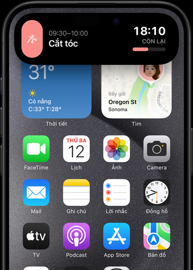 Dynamic Island hiển thị linh động các cảnh báo và Hoạt Động Trực Tiếp, nhờ đó bạn sẽ không bỏ lỡ thông tin khi đang làm việc khác. Bạn có thể dễ dàng theo dõi chuyến đi kế tiếp của mình, tỷ số của các trận đấu thể thao, tình trạng chuyến bay và nhiều thông tin khác.
