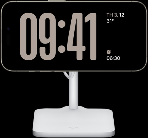 Chế độ Chờ3 mang đến cho bạn trải nghiệm toàn màn hình mới mẻ trên iPhone với những thông tin bạn có thể xem nhanh từ xa. Dựng ngang điện thoại trong khi sạc để hiển thị thời gian hay những bức ảnh bạn yêu thích, hoặc theo dõi các tiện ích của mình. Nhờ tính năng Luôn Bật, màn hình sẽ luôn hiển thị. Nhưng vào ban đêm, màn hình sẽ giảm độ sáng để bạn dễ dàng chìm vào giấc ngủ.