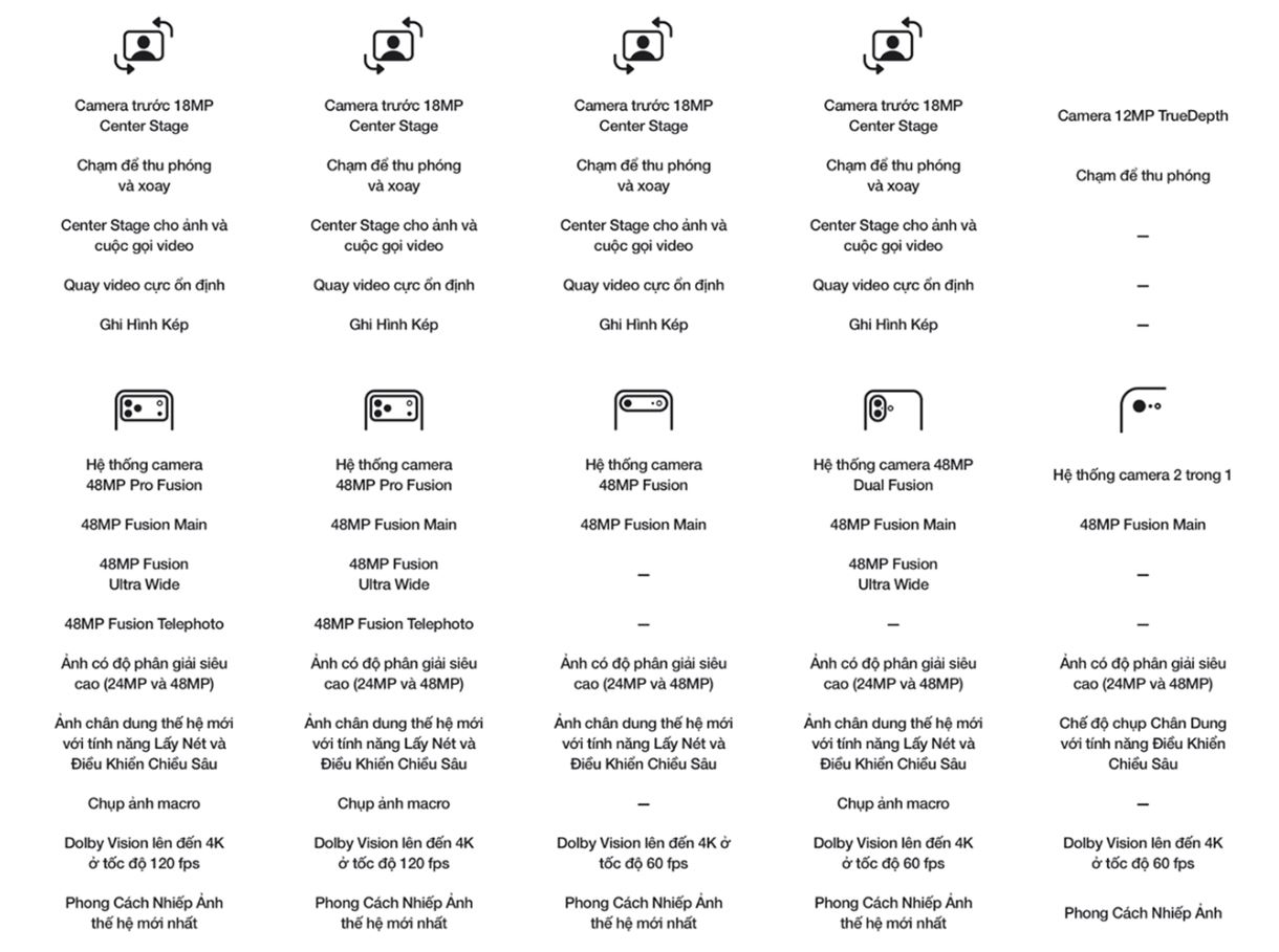 - Camera trước 18MP Center Stage - Camera sau chính 48 MP - Camera Ultra Wide 48 MP - Camera Telephoto 48 MP với zoom quang 4x và 8x |