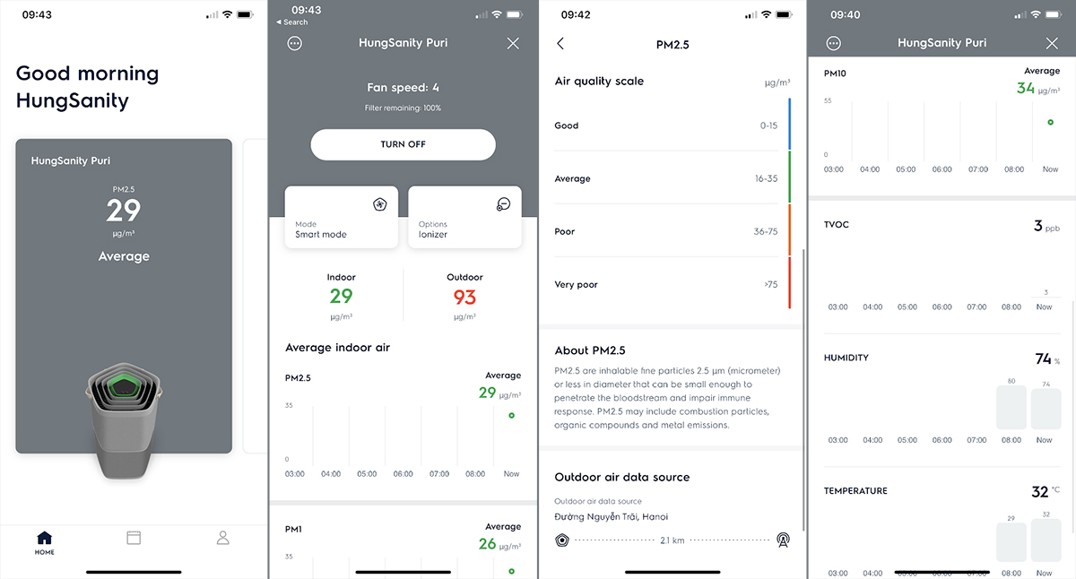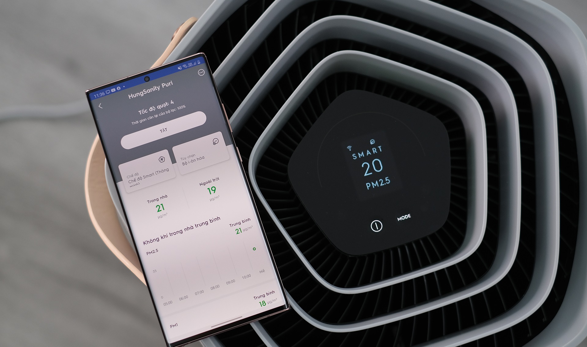 Đây là một trong những sản phẩm hiếm hoi trên thị trường có đủ cảm biến đo cả PM 1.0, PM 2.5, PM 10, nồng độ các chất hữu cơ dễ bay hơi TVOC, nhiệt độ cũng như độ ẩm trong phòng. Hơi đáng tiếc là hầu hết thông số chỉ có thể nhìn trên điện thoại. Ngoài ra, trên ứng dụng còn cho phép điều chỉnh chế độ lọc, chế độ bật/tắt ion âm.