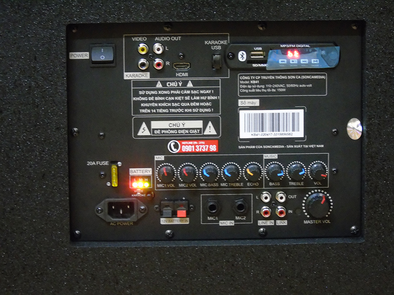 Bên trái của loa gồm các phím giúp điều chỉnh âm thanh của loa/micro và được sắp xếp theo thứ tự loa trước, micro sau với 1 dàn nút nằm thẳng tăng thêm vẻ đẹp của loa. Ngoài ra, để tối đa khả năng kết nối cho nhiều người dùng hơn loa hỗ trợ 2 cổng micro, ngay bên cạnh là cổng kết nối jack bông sen. Phía bên phải của loa có một cổng đấu bình với nguồn điện 12V và đèn báo sạc với 3 mức đèn rõ rệt.