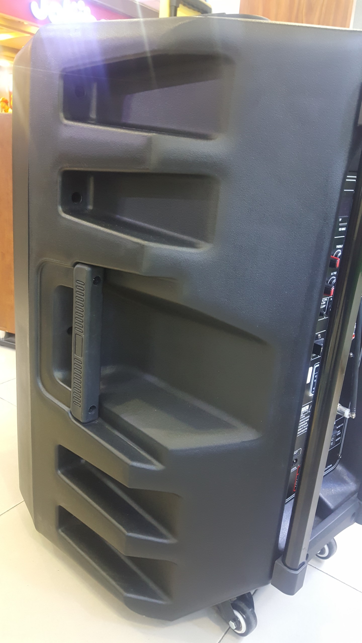 Thiết kết với kiểu dáng mới nhất năm 2018 với vỏ loa làm bằng chất liệu nhựa cứng ABS giúp bảo vệ màng loa tốt nhất. Với thiết kế 2 bánh xe sau cùng với tay cầm vô cùng tiện lợi giúp các bạn có thể kéo loa đi 1 cách dễ dàng.