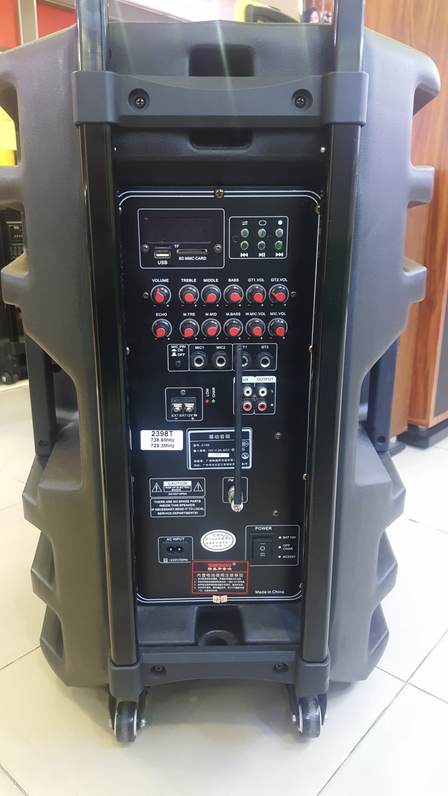 Đi kèm với Loa Kéo 2398 là cặp micro không dây cao cấp, 1 remote điều khiển từ xa và 1 dây nguồn dùng để sạc lại pin. Ngoài ra loa còn được hỗ trợ thêm cổng cắm micro có dây ngoài và cổng AV giúp bạn có thể kết nối với 1 chiếc loa khác.