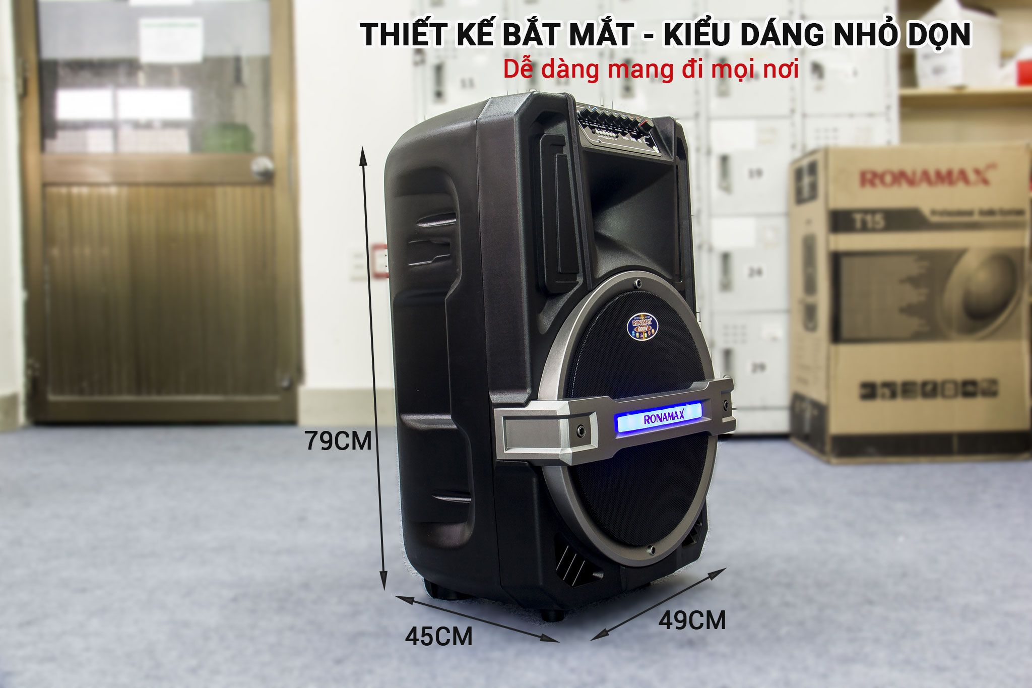 Cũng giống như thiết kế của loa T12 thì dòng T15 tạo ấn tượng ngay cái nhìn đầu tiên về phong cách thiết kế với vòng tròn bao quanh loa Bass và 1 gạch ngang giữa vòng tròn với dòng chữ Ronamax phát sáng. Ronamax T15 được thiết kế nhỏ gọn với tay kéo dài kết hợp bánh xe phía sau dễ dàng hơn trong việc di chuyển và kéo đi du lịch. Loa kéo Ronamax T15 được chăm chút tỉ. Vẫn giữ nguyên tông màu đen thân thiện Ronamax T15 khá thích hợp cho mọi chuyến du lịch xa của bạn cùng gia đình.