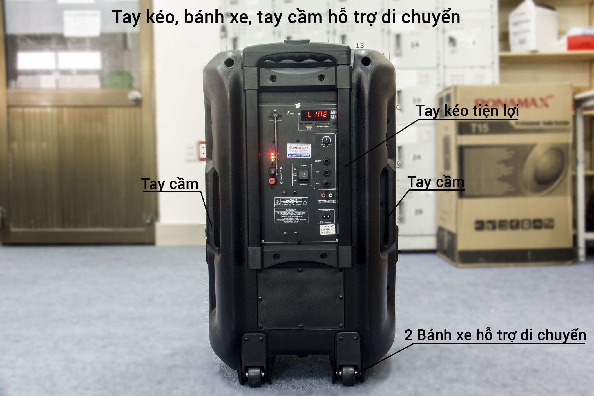 Cũng giống như Loa T12 thì Loa T15 cũng tích hợp được nhiều tính năng trên thiết bị . Một sản phẩm Loa kéo thường mang trên mình những tính năng như kết nối bluetooth , amply nằm trên loa ( chỉnh âm lượng , bass và treble hoặc thêm nhiều tính năng khác tùy theo mỗi dòng loa ) sử dụng điện trực tiếp hoặc bình Acqui , có micro kèm theo , các cổng kết nối âm thanh như USB , đầu đĩa , điện thoại , laptop ( hoặc các cổng kết nối khác tùy theo mỗi model loa kéo di động)
