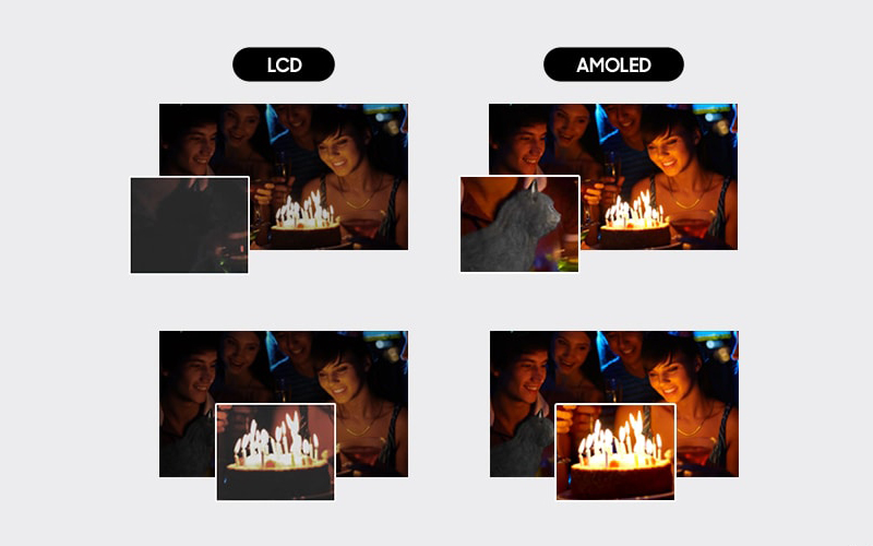 So với màn hình LCD, AMOLED tái tạo màu cho và độ chân thực cao hơn, màu đen đậm (độ tương phản lớn) hơn, hình ảnh nét hơn và góc nhìn rộng hơn đáng kể.