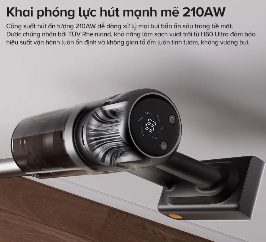 Điểm nhấn làm nên sự khác biệt và đẳng cấp của Roborock H60 Ultra chính là lực hút cực khủng 210AW (Air Watts). Con số này không chỉ là một thông số kỹ thuật, mà là minh chứng cho khả năng làm sạch vượt trội của máy. Với sức mạnh đáng kinh ngạc này, H60 Ultra dễ dàng: