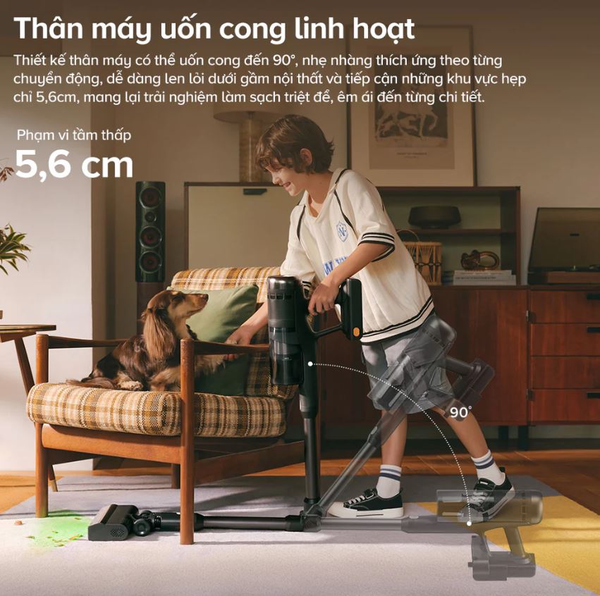 Thiết kế thân máy: Thân máy uốn cong 90° linh hoạt, dễ dàng làm sạch dưới gầm nội thất và các khu vực hẹp.