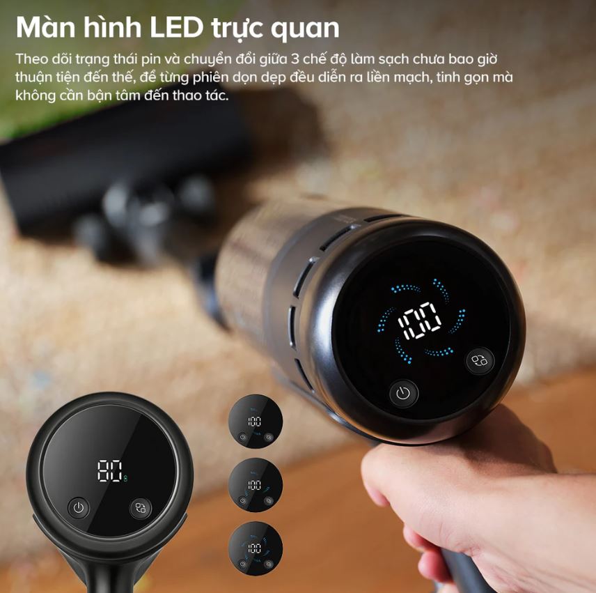 Màn hình hiển thị: Màn hình LED trực quan, hiển thị rõ ràng chế độ hút, dung lượng pin và các cảnh báo trạng thái.