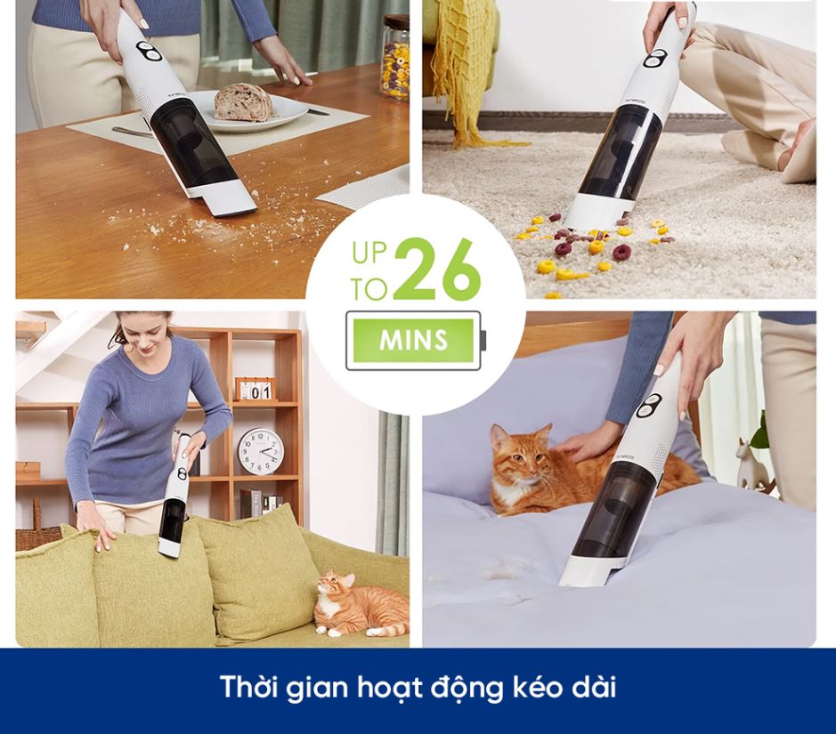 So với máy hút bụi thẳng đứng, chổi điện và các dụng cụ vệ sinh khác thì máy hút bụi cầm tay không dây thông minh Tineco PURE ONE MINI S4 này tốt hơn để có thể sử dụng hàng ngày. Được trang bị viên pin lithium-ion với thời gian sạc đầy chỉ trong khoảng 2 giờ và cung cấp thời gian hoạt động lên tới 26 phút.