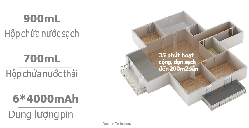 Pin dung lượng cao 6*4000 mAh cho thời gian sử dụng lên đến 35 phút, Hộp chứa nước sạch nước thải được mở rộng dung tích là 700 mL và 900 mL