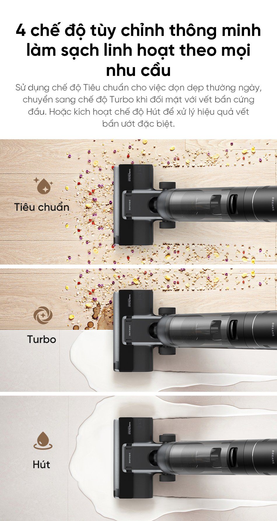 Hút Bụi và Lau Sàn Đồng Thời: Đây là tính năng "ăn tiền" nhất của Dreame G10. Thay vì phải hút bụi xong rồi mới lau, Dreame G10 giúp bạn thực hiện cả hai công việc chỉ trong một lần di chuyển. Mọi loại bụi bẩn khô như tóc, vụn thức ăn hay các vết bẩn ướt như nước đổ, vết dầu mỡ đều được xử lý gọn gàng.