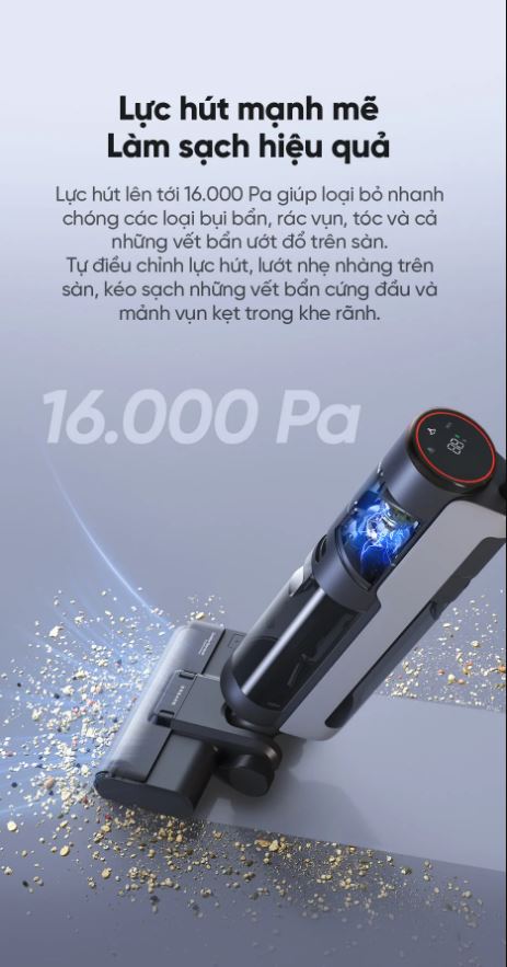 Dreame H12S AE sở hữu lực hút mạnh mẽ lên tới 16000PA giúp loại bỏ nhanh chóng các bụi bẩn,rác vụn và tóc và các vết bẩn ướt trên sàn nhà.