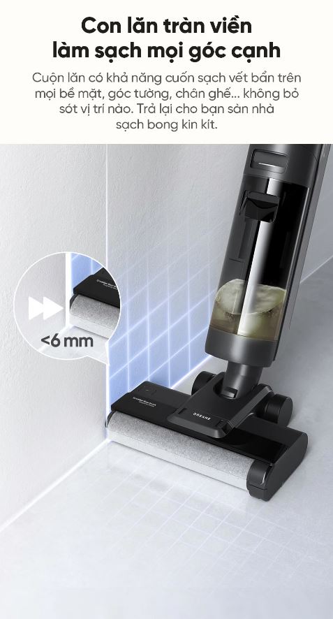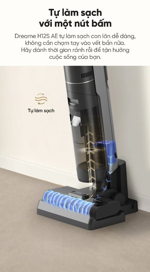 Dreame H12s AE Tự làm sạch con lăn dễ dàng chỉ với một nút bấm, không cần chạm tay vào vết bẩn.