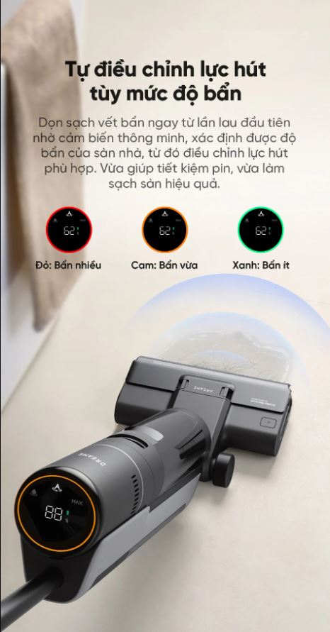 Dreame H12S AE có thể tự điều chỉnh lực hút tùy mức độ bẩn trên mặt sàn để tăng lực hút thích hợp