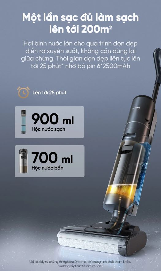 Trang bị viên pin 6*2500mAh cho thời gian dọn dẹp liên tục lên tới 25p và thời gian một lần sạc đủ làm sạch lên tới 200m2