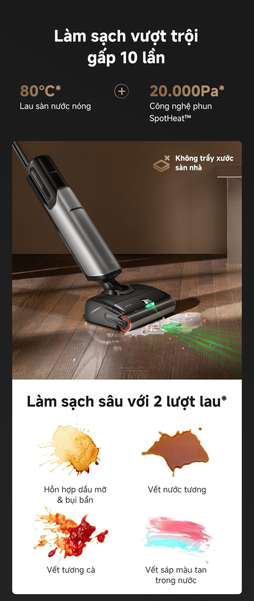 Sức Hút Mạnh Mẽ: Lực hút 20.000Pa (với động cơ không chổi than 104.000RPM), đủ mạnh để xử lý mọi loại rác ướt và khô, từ tóc, bụi mịn đến các chất lỏng dính.