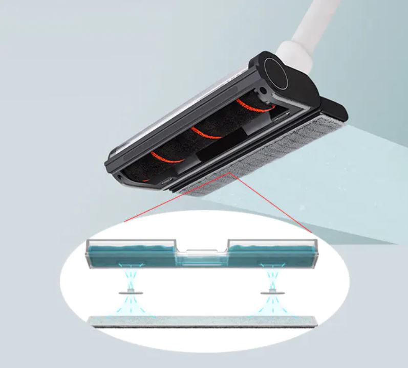 Roidmi X20 được trang bị thêm hệ thống lau được gắn trực tiếp phía sau máng hút, với 1 bình nước được cấu tạo với 2 lỗ thẩm thấu cung cấp nước cho miếng lau phía dưới, với cấu trúc miếng lau đặc biệt.