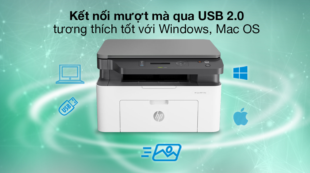 Máy in HP Laser Trắng đen đa năng In scan copy LaserJet 135a (4ZB82A) hỗ trợ in tài liệu qua đường truyền có dây từ cổng USB 2.0 với các laptop, PC vận hành trên nền tảng Mac OS, Windows.