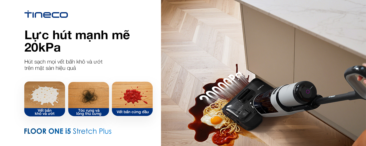 Lực hút 20.000Pa của Tineco Floor One i5 Stretch Plus là một bước đột phá, mang lại khả năng làm sạch vượt trội: