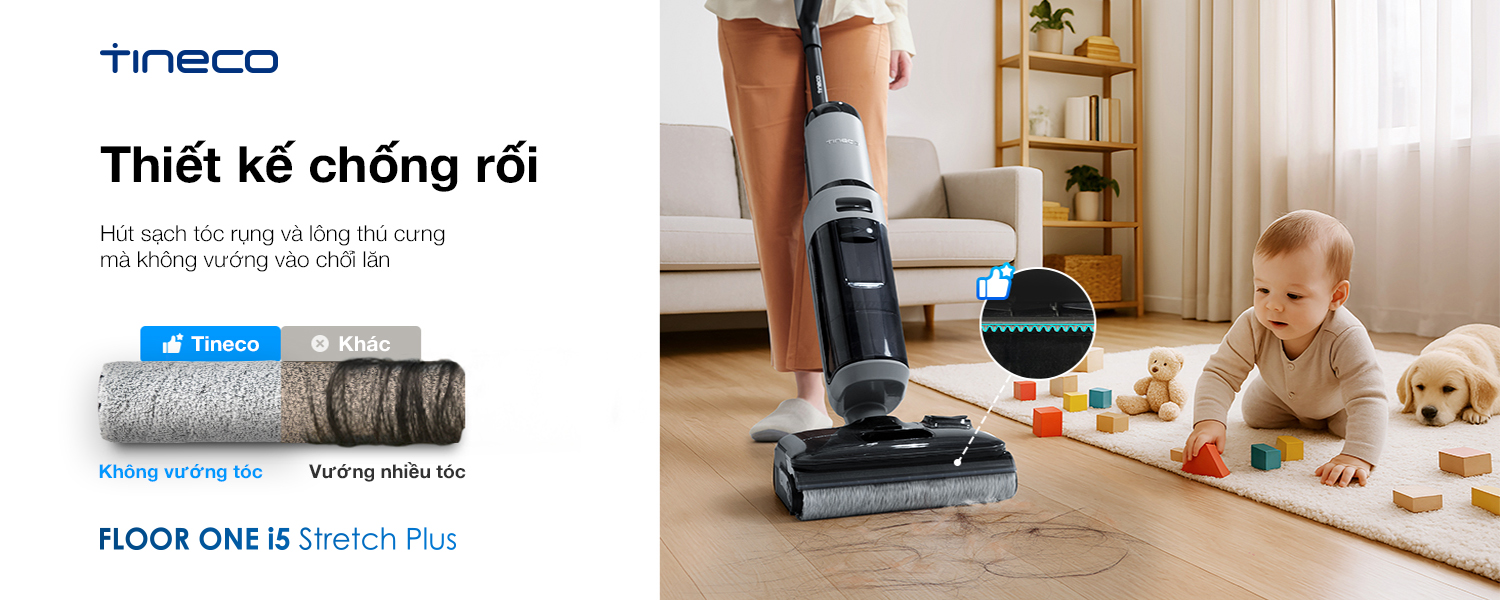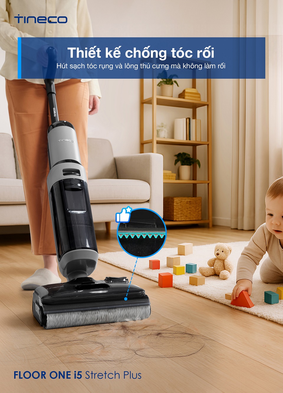 Công nghệ này giúp Tineco Floor One i5 Stretch Plus duy trì hiệu suất làm sạch liên tục, đặc biệt phù hợp cho gia đình có thú cưng hoặc trẻ nhỏ, nơi sàn nhà thường xuyên bám bẩn