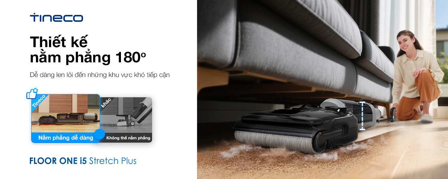 Tineco Floor One i5 Stretch Plus sở hữu thiết kế siêu mỏng với chiều cao chỉ 13cm khi gập phẳng 180°. Điều này cho phép máy dễ dàng len lỏi vào các khu vực khó tiếp cận như gầm giường, sofa hay tủ thấp. Đầu hút có thể xoay linh hoạt 45°, giúp làm sạch các góc cạnh và mép tường một cách hiệu quả.