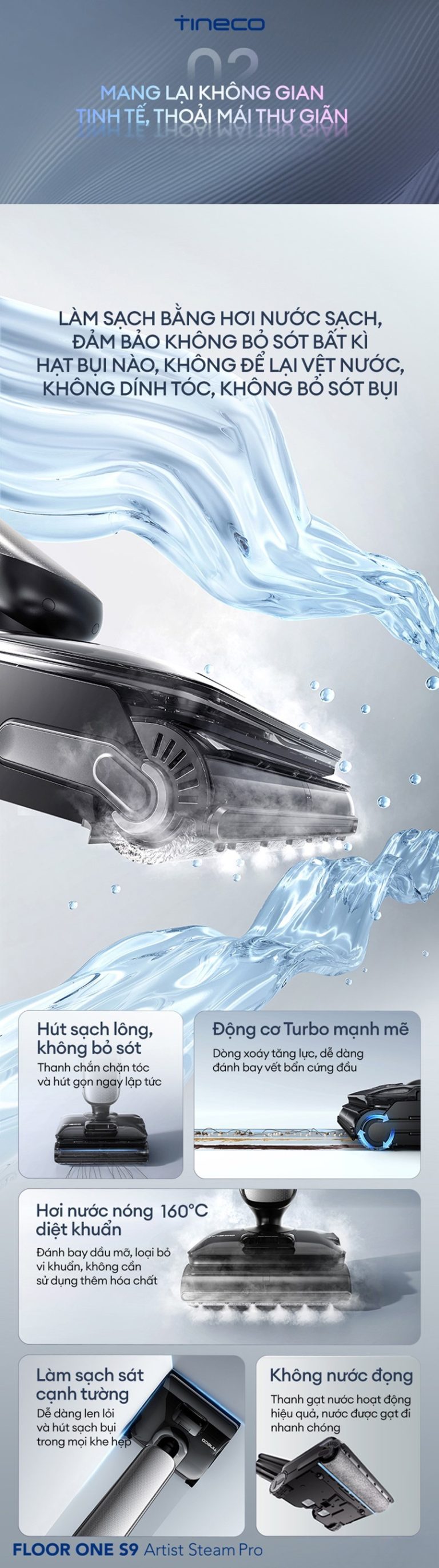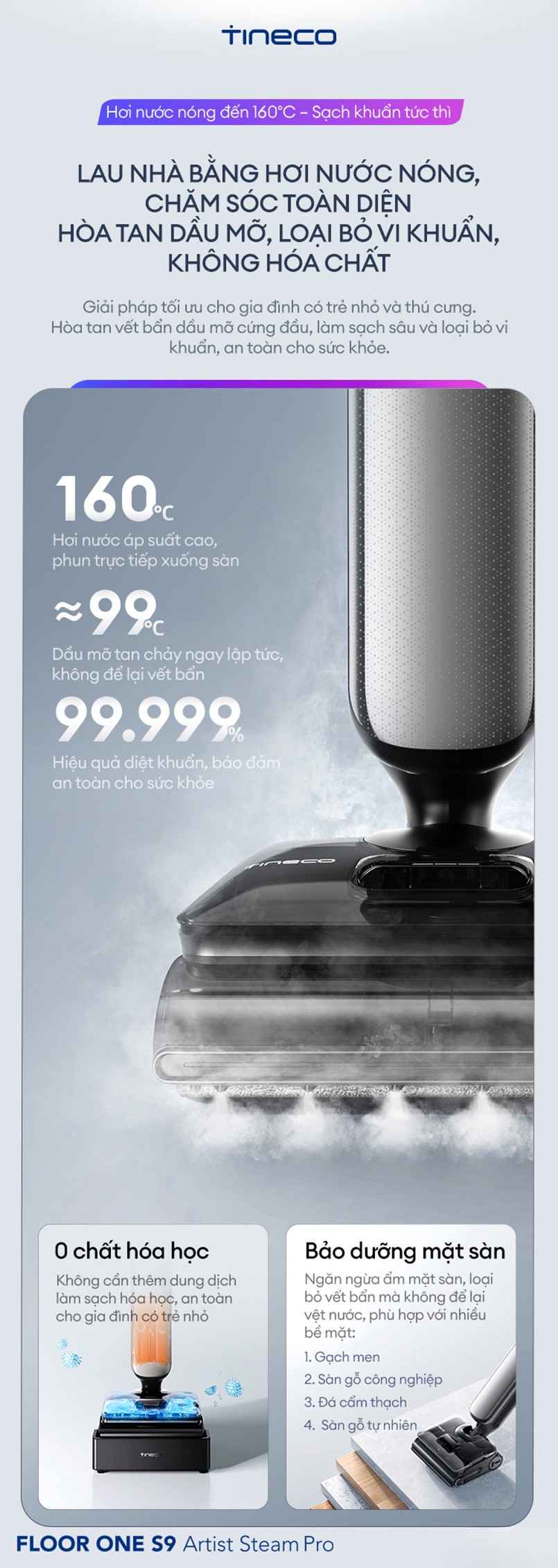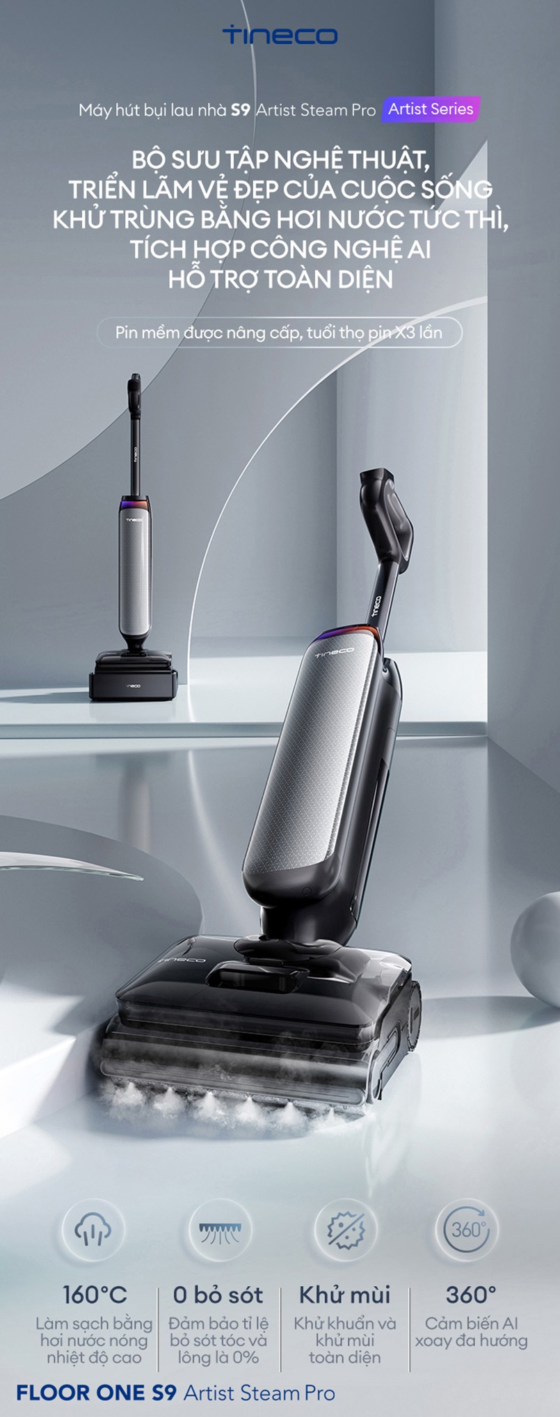 Cuối năm 2025, máy hút bụi lau sàn khô ướt Tineco Floor One S9 Artist Steam Pro chính hãng đang là siêu phẩm cao cấp nhất từ Tineco, thuộc dòng Artist Series với công nghệ hơi nước HyperSteam 160°C, lực hút 22.000Pa và thời gian sử dụng lên đến 90 phút. Sản phẩm kết hợp hút bụi, lau sàn và khử khuẩn bằng hơi nước nóng trong một bước, lý tưởng cho sàn cứng, nhà có thú cưng hoặc trẻ nhỏ. Đây là lựa chọn đỉnh cao cho vệ sinh sâu, diệt khuẩn 99.999% mà không cần hóa chất mạnh!