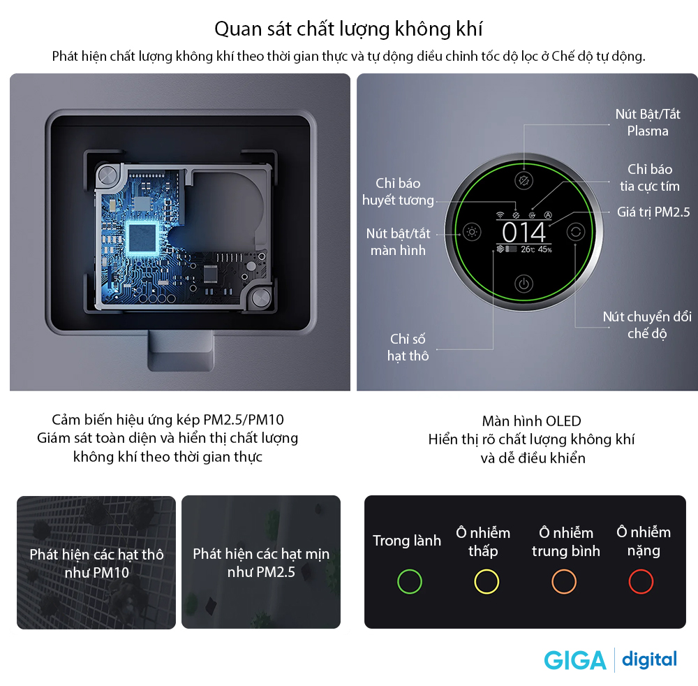 Máy lọc không khí Xiaomi Elite nổi bật khả năng theo dõi phát hiện chất lượng không khí chính xác theo thời gian thực nhờ trang bị công nghệ cảm biến hiệu ứng kép PM2.5/PM10 và tự động điều chỉnh tốc độ lọc ở chế độ tự động. Bên cạnh đó, máy lọc được trang bị màn hình OLED hiển thị thông số sản phẩm sắc nét, dễ dàng quan sát để vận hành hơn.