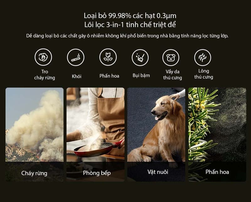 Với lõi lọc 3 in 1 tinh chế triệt để giúp đánh bay hoàn toàn các loại hạt có kích thước 0.3μm dễ dàng như khói thuốc lá, phấn hoa, lông thú cưng, vảy da thú cưng,…