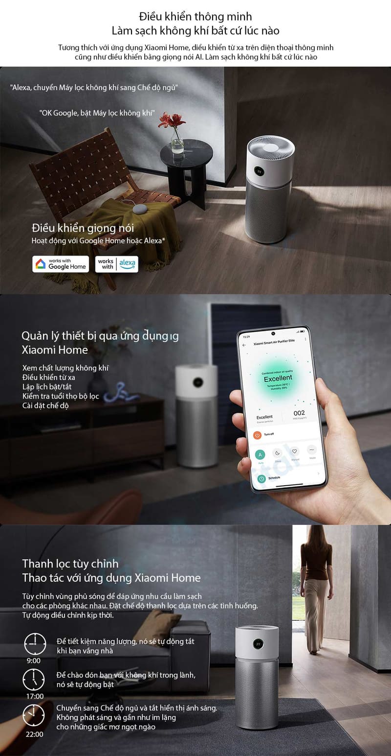 Máy lọc không khí thông minh Xiaomi Elite là giải pháp hiện đại thông minh cho cuộc sống trong lành. Xiaomi Elite có khả năng loại bỏ đến 99.9% virus cúm A trong không khí, loại bỏ hiệu quả bụi và mùi hôi, các chất dị ứng. Bên cạnh đó, máy lọc không khí này có thể hoạt động trong không gian với diện tích lên tới 125m2 cùng cảm biến hiệu ứng kép PM2.5/PM10, độ ồn thấp < 20.2dB, khả năng điều khiển từ xa thông minh,…