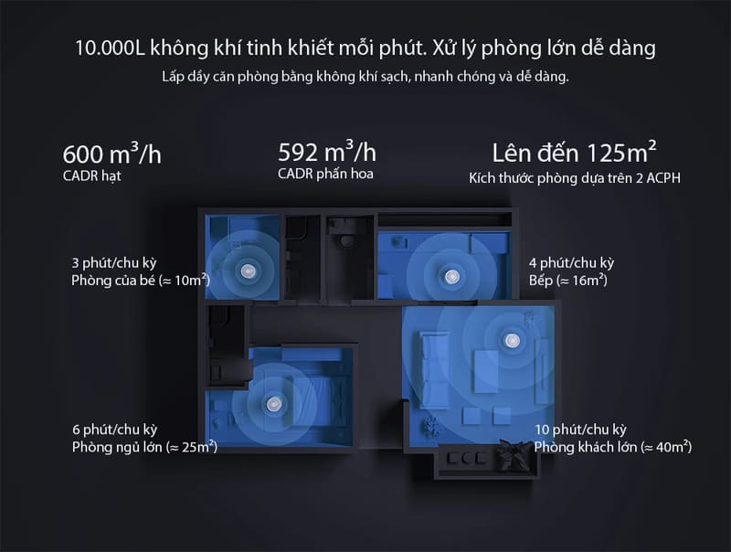 Máy lọc không khí khử trùng Xiaomi Elite có khả năng lọc được 10.000 lít không khí tinh khiết nhanh chóng, dễ dàng trả lại căn phòng của bạn không khí sạch. Máy lọc có thể làm sạch 592m3/h CADR phấn hoa, 600m3/h CADR hạt và có thể lọc sạch không gian căn phòng có diện tích rộng tới 125m2.