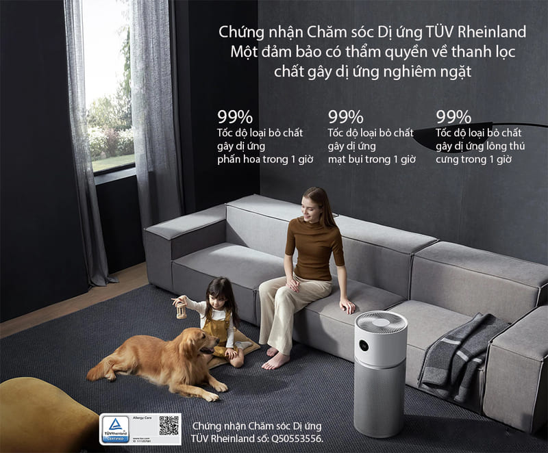 Xiaomi Mi Air Purifier Elite đạt được chứng nhận chăm sóc dị ứng TÜV Rheinland – đây là tổ chức có thẩm quyền đảm bảo về thanh lọc các chất gây dị ứng nghiêm ngặt nhất. Nên sản phẩm có thể thanh lọc giảm hiệu quả các chất gây dị ứng có trong không khí nhà bạn với tốc độ loại bỏ đạt tới 99.9% các chất gây dị ứng hạt bụi, phấn hoa, và cả lông thú cưng trong 60 phút.