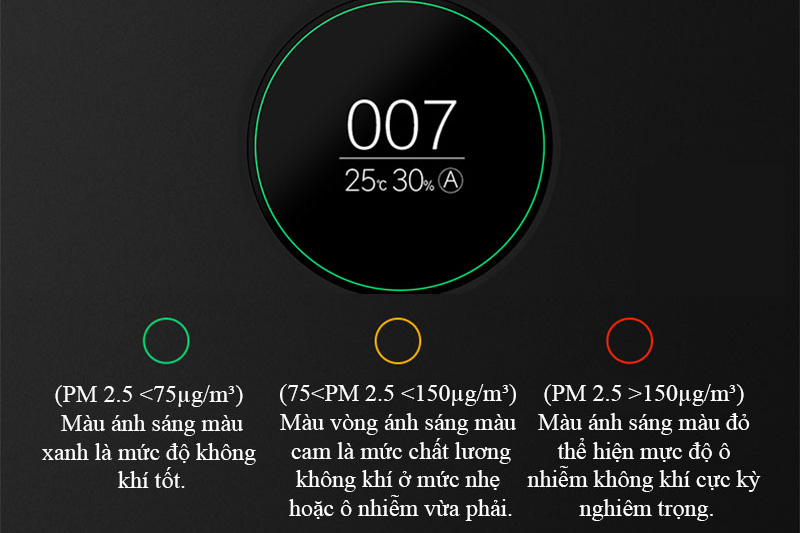 Vòng hiển thị 3 màu cho phép nhận biết tình trạng không khí căn cứ theo cảm biến đo nồng độ PM 2.5 trong nhà