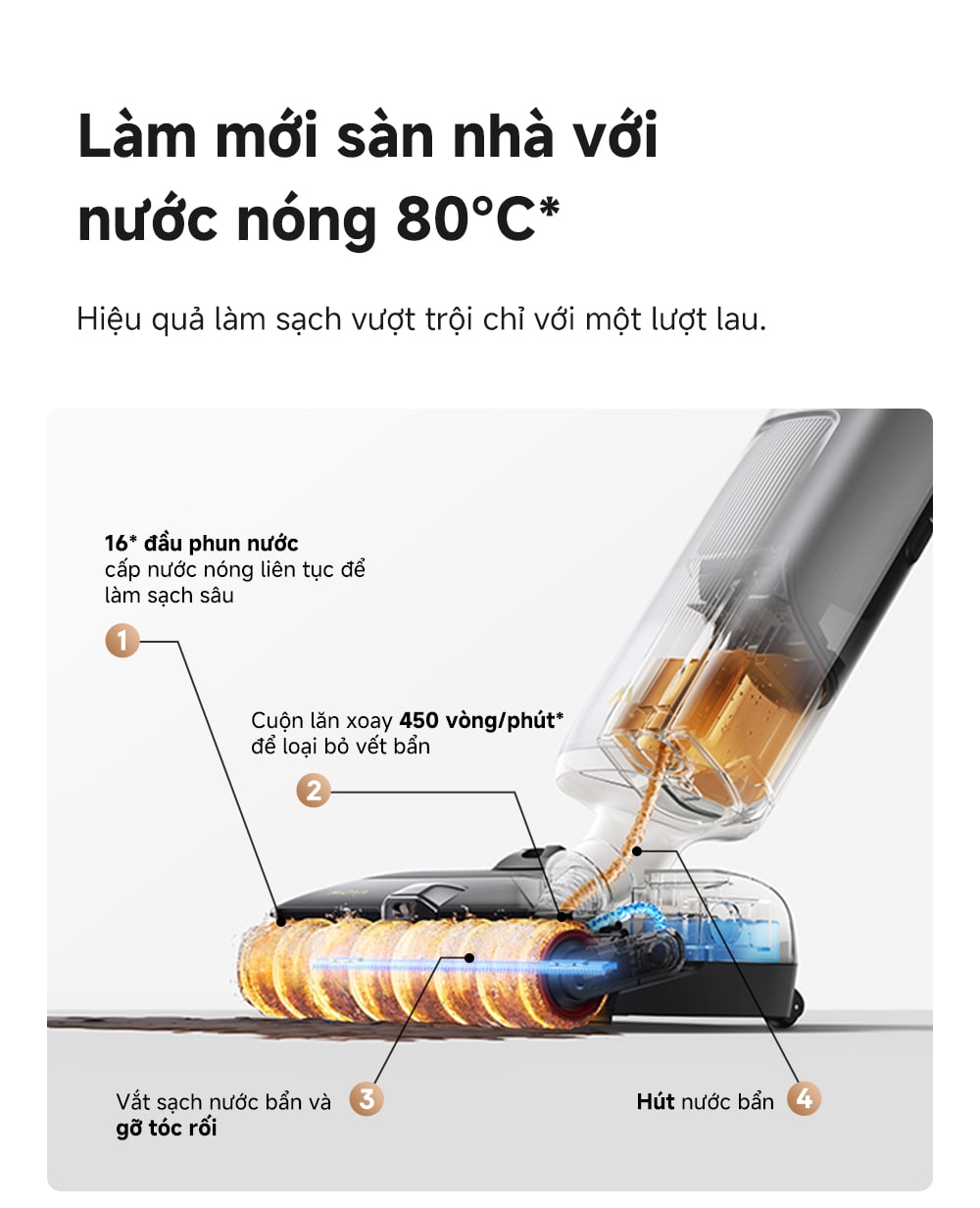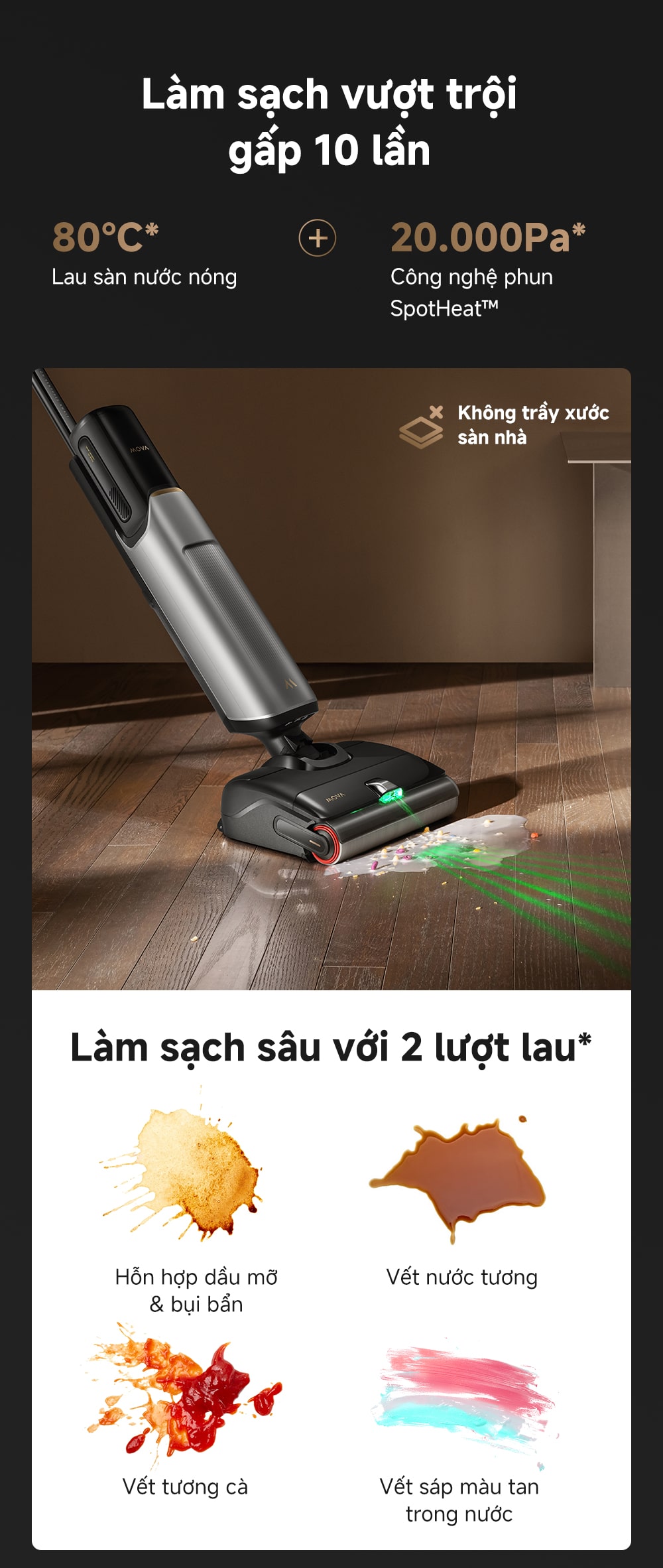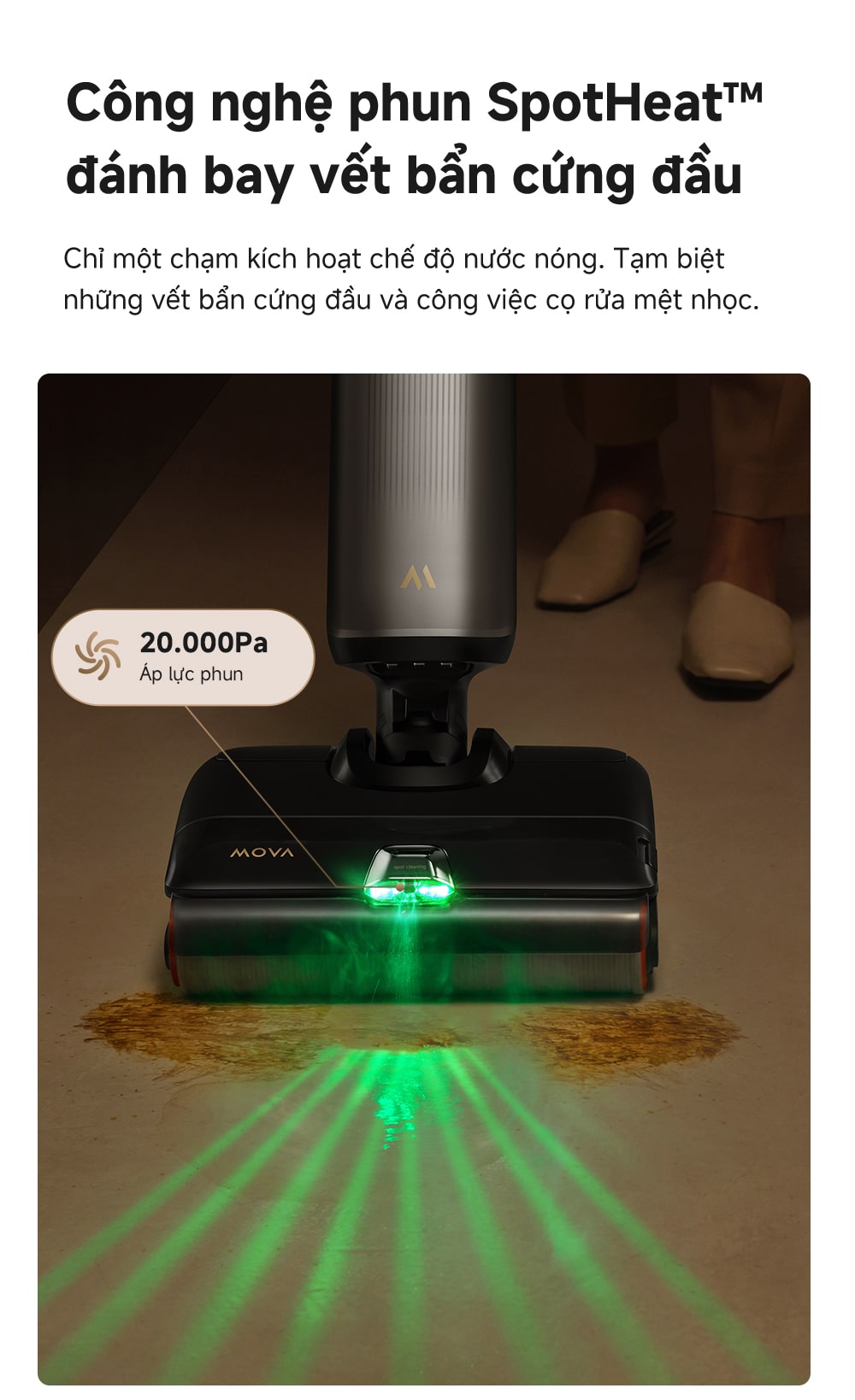Công nghệ làm nóng nước tức thì và phun SpotHeat độc đáo giúp hòa tan và loại bỏ các vết bẩn cứng đầu như nước tương khô chỉ sau 1-2 lần lau, hiệu quả hơn gấp 10 lần so với nước lạnh. Đặc biệt, chế độ nước nóng này còn được chứng nhận an toàn cho sàn nhà bởi TÜV Rheinland.